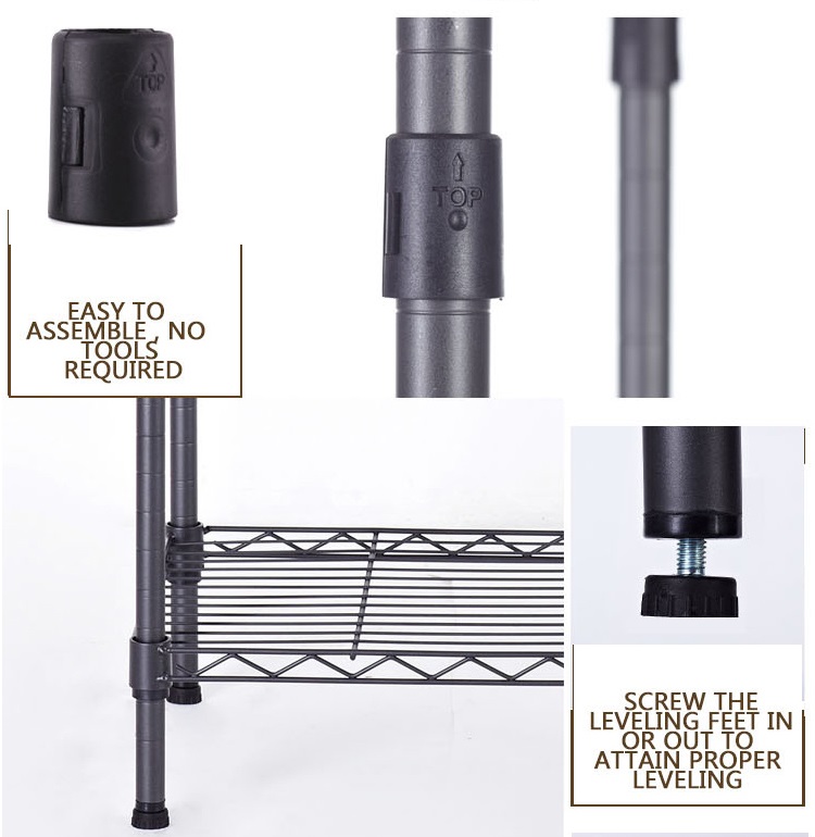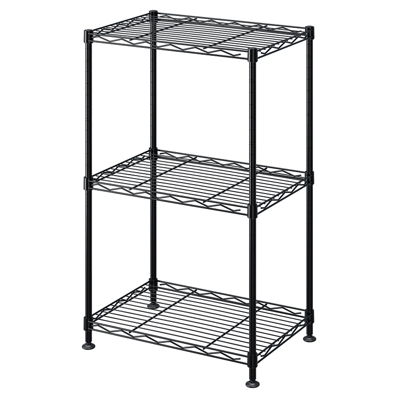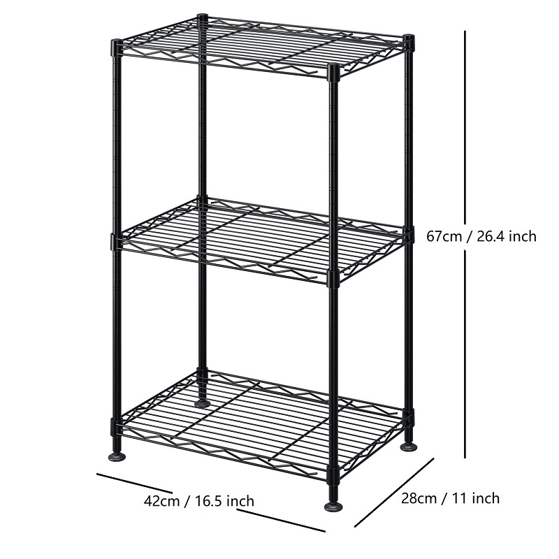 Transform your storage space with this versatile 3-tier wire shelving rack. Built with durability in mind, this heavy-duty metal storage unit features three adjustable shelves that can accommodate up to 100 pounds each. The sleek black finish and open wire design not only adds a modern touch but also allows for easy visibility of stored items. With dimensions of 16.5 inches in length, 11 inches in width, and 26.4 inches in height, this compact unit maximizes vertical storage while maintaining a small footprint. Assembly is a breeze – no tools required, and it can be set up in just 10 minutes. The adjustable leveling feet ensure stability on uneven surfaces with a simple twist. Perfect for organizing everything from kitchen supplies to office essentials, this shelving unit offers flexible storage solutions with adjustable shelf heights to accommodate items of various sizes. The sturdy steel construction provides lasting durability with anti-rust and corrosion resistance properties, making it suitable for long-term use in any indoor setting.