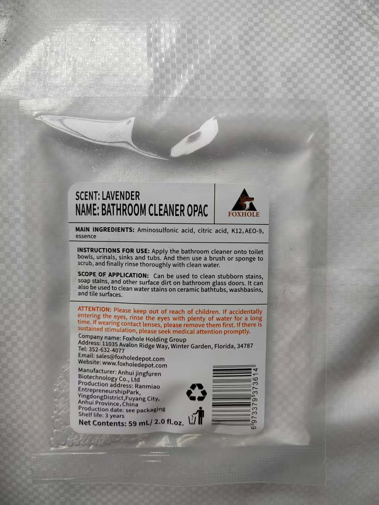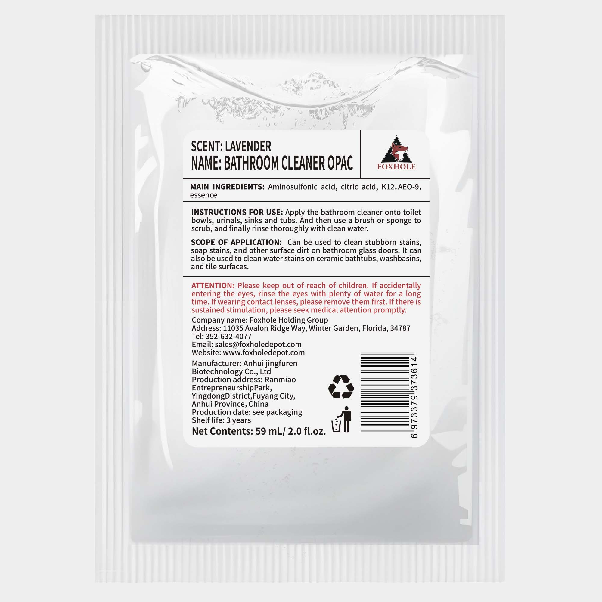 This lavender-scented bathroom cleaner from FOXHOLE is a powerful solution designed to tackle the toughest bathroom cleaning challenges. Formulated with aminosulfonic acid, citric acid, and specialized cleaning agents, this versatile cleaner effectively removes stubborn stains, soap scum, and surface dirt from toilet bowls, urinals, sinks, tubs, and bathroom glass doors. The convenient 2.0 fluid ounce (59 mL) packets make it easy to use the right amount every time without waste or mess. Simply apply the cleaner to the desired surface, scrub with a brush or sponge, and rinse thoroughly with clean water for a sparkling clean finish. The pleasant lavender scent leaves your bathroom smelling fresh and inviting. This bathroom cleaner is also effective on water stains found on ceramic bathtubs, washbasins, and tile surfaces. Each case contains 250 individual packs, making it an economical choice for households, offices, or commercial cleaning operations. With a shelf life of 3 years, you can stock up and always have this reliable cleaning solution on hand when you need it most.
