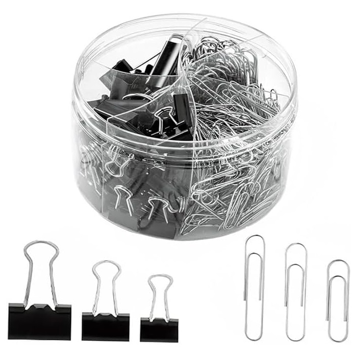 Easy Storage: The binder clips, paper clips, and rubber bands are neatly stored in a transparent plastic box for easy access and organized office space.