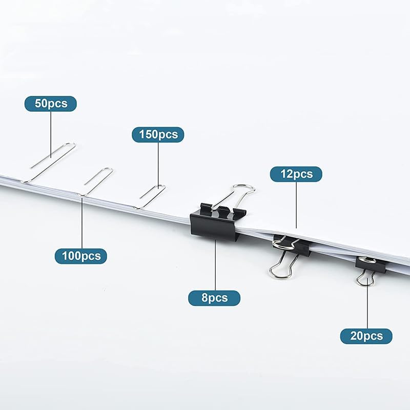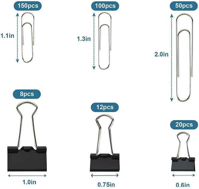 Package Includes: 40 binder clips (3 sizes: 0.6″, 0.75″, 1.0″), 300 paper clips (3 sizes: 2.0″, 1.3″, 1.1″), totaling 340 pieces to meet your various organizational needs and preferences.