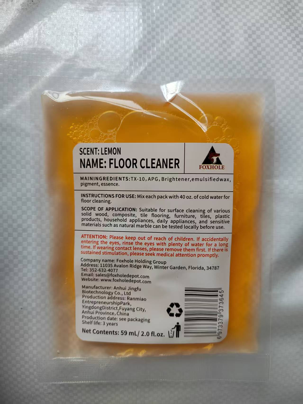This lemon-scented concentrated floor cleaner from FOXHOLE delivers powerful cleaning performance in a convenient, easy-to-use format. Each 2.0 fl oz (59 mL) pack is designed to be mixed with 40 oz of cold water, creating an effective cleaning solution that tackles dirt and grime across multiple surfaces. The refreshing lemon scent leaves your floors smelling clean and fresh after every use. This versatile cleaner is suitable for various surface types including solid wood, composite flooring, tile, furniture, plastic products, and household appliances. The concentrated formula means a little goes a long way, making this an economical choice for both residential and commercial cleaning needs. With 250 packs per case, you’ll have plenty of cleaning power on hand for all your floor care requirements. The formula contains TX-10, APG, brightener, emulsified wax, pigment, and essence to provide thorough cleaning while leaving surfaces looking their best. Please note that delicate materials such as natural marble should be tested in an inconspicuous area before full application.